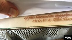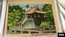 Ông cho VOA xem một trong hai bức tranh đó. Khung tranh bị vỡ và được dán lại tạm bằng giấy. Bên dưới hình ảnh Chùa Một Cột mang tính biểu tượng là dòng chữ viết tay bằng tiếng Anh, “Quà tặng từ Cục trưởng Cục Lãnh sự - Bộ Ngoại giao Việt Nam.”