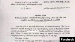 Kèm theo ảnh chụp màn hình phát biểu trên, còn có một văn bản thông báo về “Kết luận của Ban Chấp hành Đảng bộ Trường Chính trị Trần Phú tại phiên họp bất thường ngày 06 tháng 5 năm 2019”.