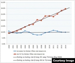 Một năm sau, điều mà tác giả từng gióng lên hồi chuông báo động trên đây lại càng… đáng báo động: Trong khi tốc độ gia tăng xuất khẩu sang Trung Quốc chỉ tăng 13% thì tốc độ gia tăng nhập khẩu từ Trung Quốc lại tăng đến 18%; hệ quả là tỷ trọng kim ngạch nhập khẩu từ Trung Quốc chiếm tới 29,5% tổng kim ngạch nhập khẩu, tăng 1,5 % so với năm 2013. (Lưu ý: Mặc dù xuất khẩu sang Trung Quốc tăng 13% song tỷ trọng xuất khẩu sang Trung Quốc trong tổng kim ngạch xuất khẩu năm 2014 vẫn chỉ chiếm 9,9% như năm ngoái, và gần như không thay đổi kể từ năm 2000 đến nay.)