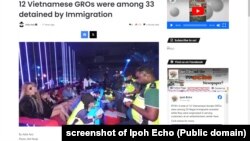 Sở Di trú Bang Perak của Malaysia, giáp miền nam Thái Lan, mới bắt giữ 33 di dân bất hợp pháp bao gồm 12 phụ nữ Việt làm nghề “chuyên viên quan hệ khách hàng”, sau khi khám xét 3 cơ sở kinh doanh gồm một trung tâm giải trí, một nhà hàng và một doanh nghiệp ở thành phố Ipoh trong bang, hai trang tin Ipoh Echo và The Star cho biết hôm 8/8.