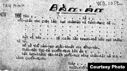 Với riêng tôi, tài liệu để lại nhiều ấn tượng nhất là một mẩu bản án được đánh máy với nhiều chi tiết để trống của Giải phóng quân thị xã Tây Ninh vào năm 1965. Mẩu giấy bao gồm các chi tiết: