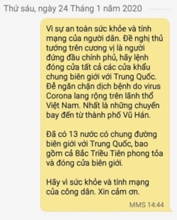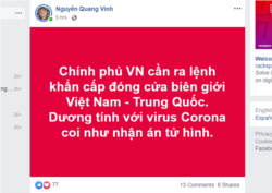 Các tài khoản Facebook Nguyễn Xoan, Nguyễn Quang Vinh và nhiều người khác kêu gọi lãnh đạo Việt Nam hãy “đóng ngay cửa khẩu biên giới Việt – Trung” vì bệnh viêm phổi do virus corona "đang vào Việt Nam từ Trung Quốc”. Họ còn kêu gọi mỗi người “hãy hành động ngay lập tức” và “lên tiếng để bảo vệ mạng sống mình” vì bị nhiễm virus corona là "coi như nhận án tử hình".
