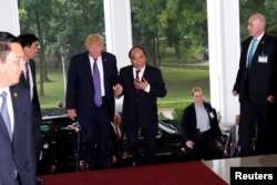 Thủ tướng Nguyễn Xuân Phúc nắm tay dẫn Tổng thống Trump đi vào Văn phòng Chính phủ khi ông đến dự cuộc hội đàm song phương tại Hà Nội.
