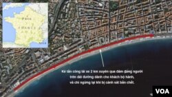 - Có ít nhất 84 người thiệt mạng và hàng chục người khác bị thương. Tổng thống Pháp Francois Hollande cho biết sau khi đi thăm một bệnh viện ở Nice rằng 50 người còn đang ở tình trạng “nửa sống nửa chết.” Các nạn nhân đang xem pháo hoa dọc theo con đường gỗ ven bờ biển và vui chơi sau màn trình diễn.